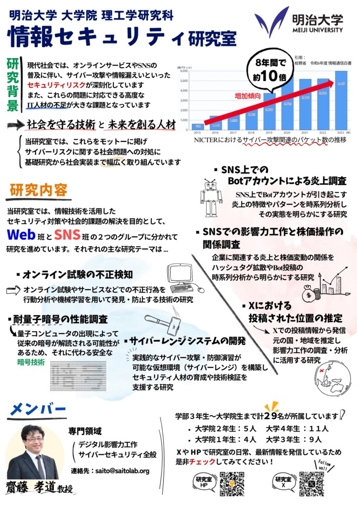 8/2(土)、8/3(日)に生田キャンパスにて、オープンキャンパスが行われました。情報セキュリティ研究室では、ポスターやスライドを作成し、高校生に向けて研究テーマや研究室の紹介を行いました!